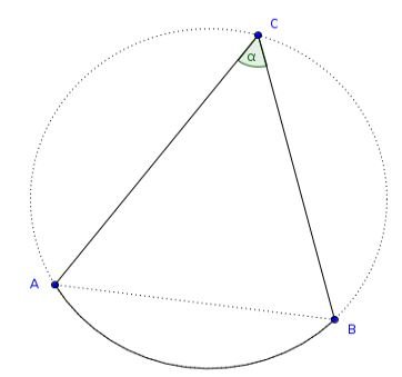 An inscribed angle is the angle $\alpha$ contained by the straight lines joining the ends of the arc $AB$ with any point on the circumference of a segment of the circle.