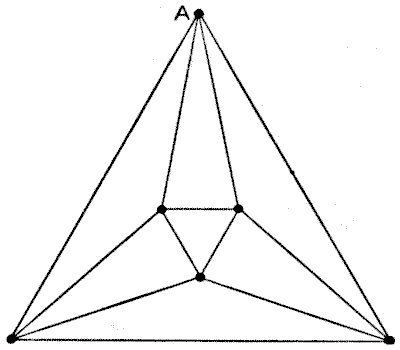 Though we cannot really see all the sides of the octahedron at once, we can make a projection of it that suits our purpose just as well. In the diagram, the six points represent the six angles of the octahedron, and four lines proceed from every point under exactly the same conditions as the twelve edges of the solid. Therefore if we start at the point $A$ and go over all the lines once, we must always end our route at $A.$ And the number of different routes is just $1,488,$ counting the reverse way of any route as different. It would take too much space to show how I make the count. It can be done in about five minutes, but an explanation of the method is difficult. The reader is therefore asked to accept my answer as correct.